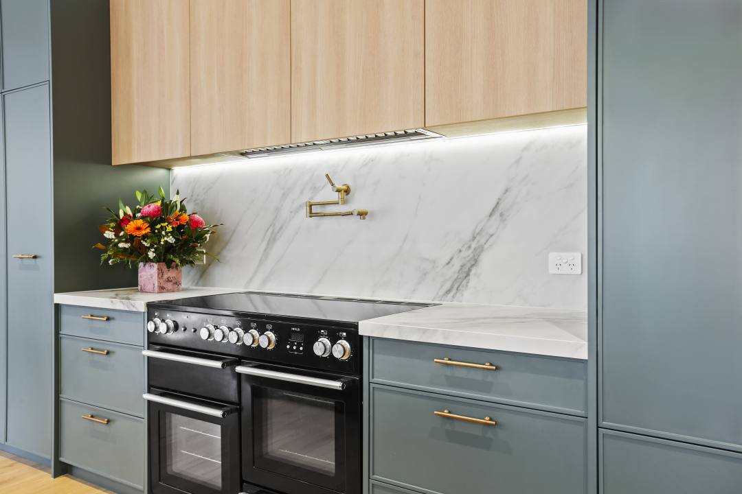 A deep green was used to encapsulate nature indoors, paired with embossed finish wall cabinetry. These selections were a winning combination, grounding the cabinetry design while providing a serene, calm environment with an organic and earthy feel. The island bench offers the perfect space to serve buffets or gather guests around, while the porcelain benchtops and splashbacks in darker colours make cleaning more manageable. The custom-made banquette seating perfects the space, winning Best Soft Furnishing in the ACFA awards last year.